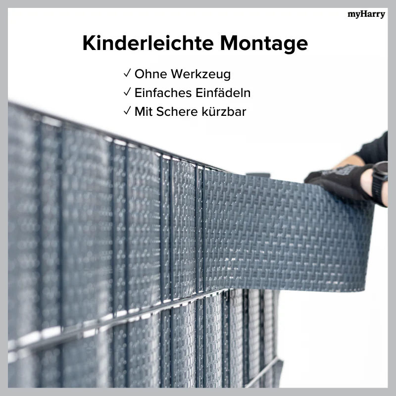 Die Anthrazit-Sichtschutzstreifen in hochwertiger und exklusiver Optik eignen sich optimal als Zaun-Sichtschutz für Ihren Garten. Zum Einflechten in die 20cm hohen Maschen jedes Doppelstabmattenzauns.